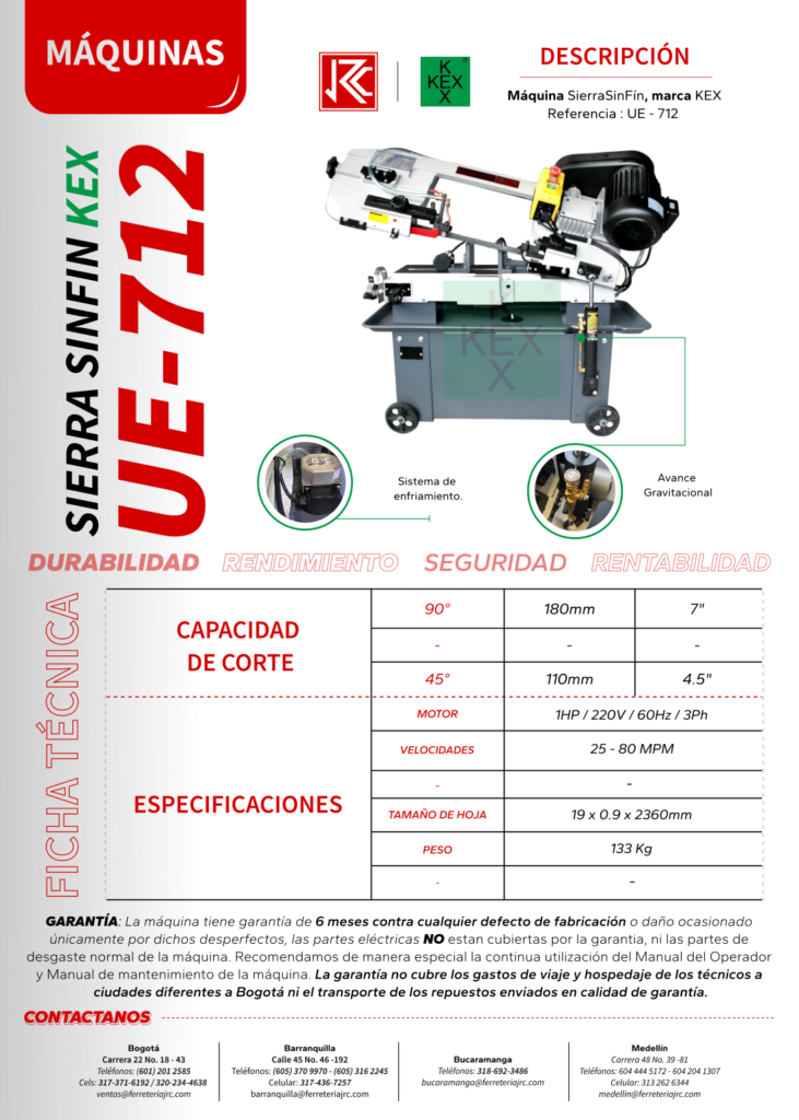 Además de la amplia variedad de maquinas sierra sinfín KEX, JRC es un proveedor especializado en herramientas de corte, instrumentos de medición, máquinas herramienta, fluidos para corte y más complementos para la industria metalmecánica en general. Para más información adicional, no dude en dejar un mensaje en los comentarios, o si lo prefiere escribanos al Whatsapp que se encuentra en la parte inferior y uno de nuestros asesores se comunicara con usted. Estamos ubicados en las ciudades de Bogotá, Barranquilla, Bucaramanga y Medellín.