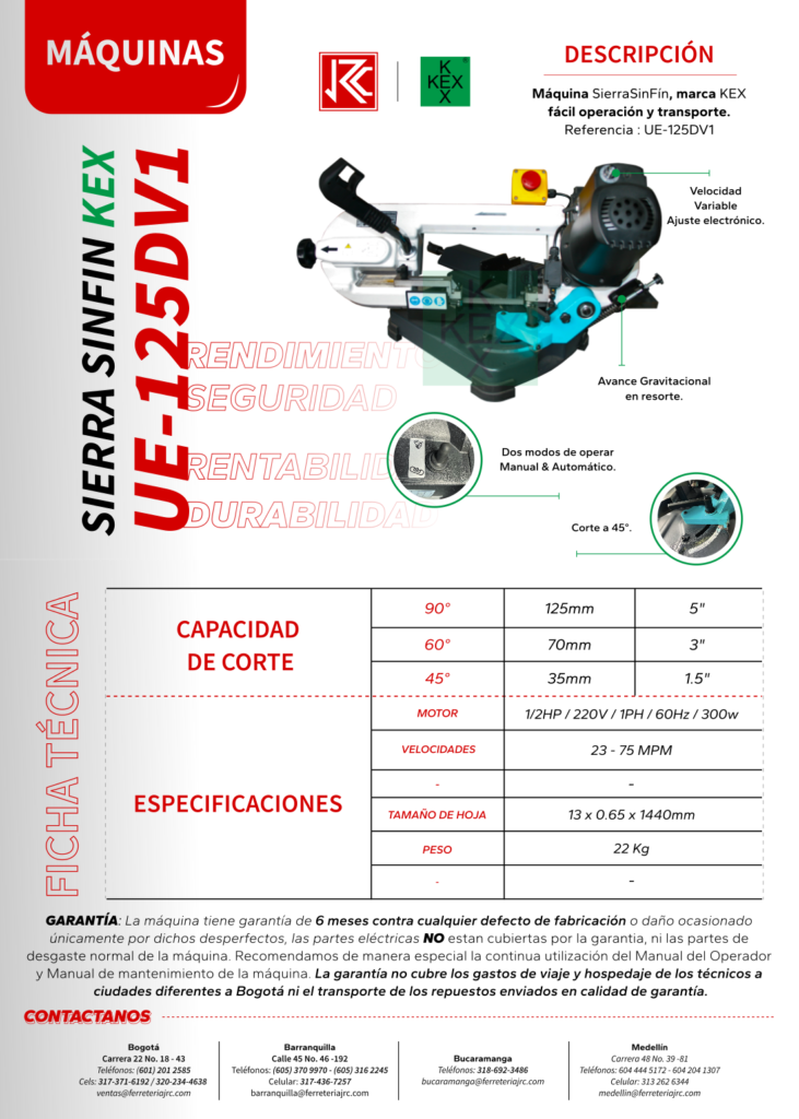 Además de la amplia variedad de maquinas sierra sinfín KEX, JRC es un proveedor especializado en herramientas de corte, instrumentos de medición, máquinas herramienta, fluidos para corte y más complementos para la industria metalmecánica en general. Para más información adicional, no dude en dejar un mensaje en los comentarios, o si lo prefiere escribanos al Whatsapp que se encuentra en la parte inferior y uno de nuestros asesores se comunicara con usted. Estamos ubicados en las ciudades de Bogotá, Barranquilla, Bucaramanga y Medellín.