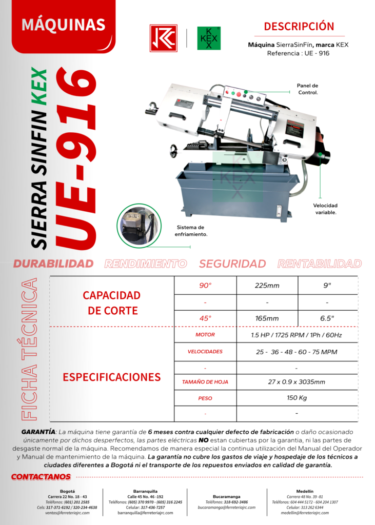 Además de la amplia variedad de maquinas sierra sinfín KEX, JRC es un proveedor especializado en herramientas de corte, instrumentos de medición, máquinas herramienta, fluidos para corte y más complementos para la industria metalmecánica en general. Para más información adicional, no dude en dejar un mensaje en los comentarios, o si lo prefiere escribanos al Whatsapp que se encuentra en la parte inferior y uno de nuestros asesores se comunicara con usted. Estamos ubicados en las ciudades de Bogotá, Barranquilla, Bucaramanga y Medellín.