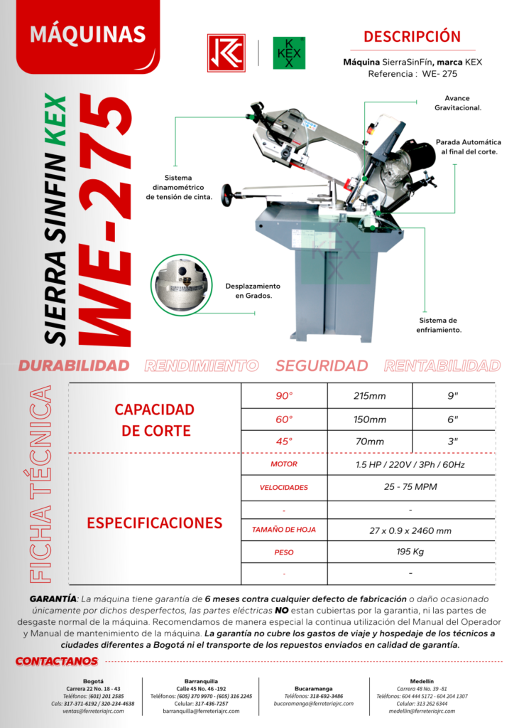Además de la amplia variedad de maquinas sierra sinfín KEX, JRC es un proveedor especializado en herramientas de corte, instrumentos de medición, máquinas herramienta, fluidos para corte y más complementos para la industria metalmecánica en general. Para más información adicional, no dude en dejar un mensaje en los comentarios, o si lo prefiere escribanos al Whatsapp que se encuentra en la parte inferior y uno de nuestros asesores se comunicara con usted. Estamos ubicados en las ciudades de Bogotá, Barranquilla, Bucaramanga y Medellín.