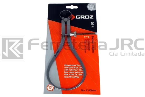 COMPAS PARA EXTERIORES GROZ Fabricado en acero de alta calidad con un acabado pulido. El ajuste de medición se realiza mediante una tuerca de ajuste que permite ajustes precisos. La capacidad de medición/tamaño es la distancia entre el punto de apoyo y el extremo de la pata. Disponible en dos tipos: a. Con tuerca solida b. Con tuerca rápida: Las roscas de la tuerca de sujeción rápida enganchan el tornillo a la menor presión de la pata y cuando se retira la presión, la tuerca se desliza libremente sobre el tornillo. Esta función ayuda a ahorrar un tiempo valioso al abrir y cerrar cuando se deben tomar varias mediciones consecutivas. Medidas: 8" - 200mm