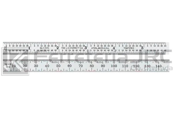 ESCUADRA REGLA STARRETT 24" Milímetros/Pulgadas. Las siguientes reglas se ajustan en cualquier componente de acuerdo a los tamaños especificados en la tabla, para todas las escuadras combinadas, escuadras combinadas completas y transportadores combinados. Longitud: 600mm - (23.1/2") Ancho x espesor: 25*2.4mm Graduación: 0.5mm y 1/32" de un lado, 1mm y 1/64" en el lado opuesto. Acabado: Cromo satinado