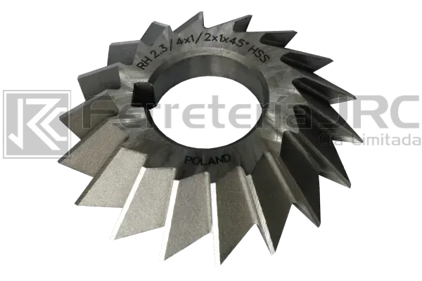 FRESA ANGULAR SENCILLA 45º DERECHA TMX Fresas angulares sencillas de corte a la derecha en Ángulos de 45°. Diámetro: 2.3/4" Ancho de cara: 1/2" Tamaño hueco: 1" Nº de dientes: 18