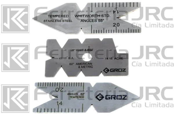 GALGAS PARA AFILADOS GROZ Fabricado en acero inoxidable endurecido y pulido, todas las superficies de los calibres están rectificadas con precisión. Útil para verificar el ángulo de la herramienta mientras se cortan roscas en tornos de torneado de metal. El ángulo de la herramienta de corte de hilo se comprueba en las ranuras en V del calibre. El relieve en el extremo de cada ranura permite el asentamiento adecuado de la herramienta de corte en la ranura, lo que garantiza el ángulo correcto. El calibre indica 55º para roscas bsf, 47-1 / 2º para roscas BA, 60º para roscas métricas y nacionales americanas y 14-1 / 2º para roscas acme.